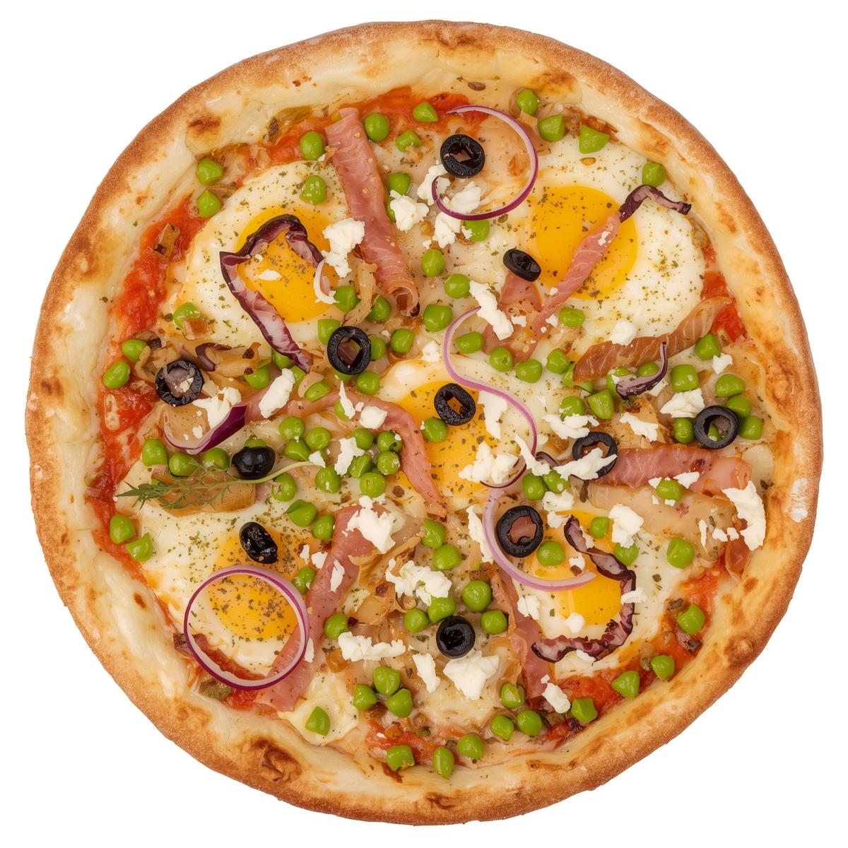PRESUNTO, ovo, ervilha, palmito, cebola, mussarela, catupiry e azeitonas picadas