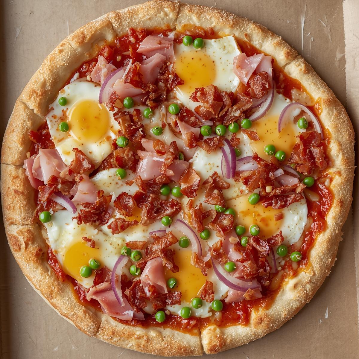 presunto, cebola, ovos, bacon, ervilha, tomate e mussarela